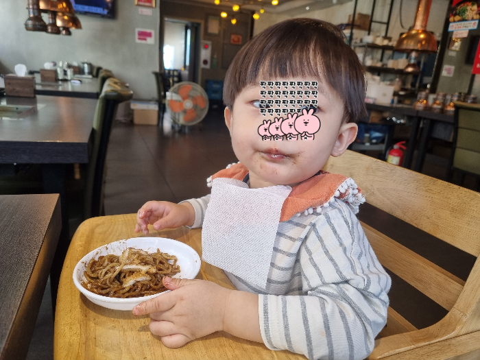 짜장면은 태어나서 처음인데 맛있었는지 저 한 그릇을 다 먹어서 깜짝 놀랐다.