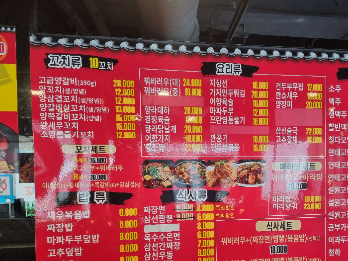 그리고 식사류에 보이는 짜장면, 삼선짬뽕에 적힌 특별 할인도 더 이상 진행하지 않는 것 같다.