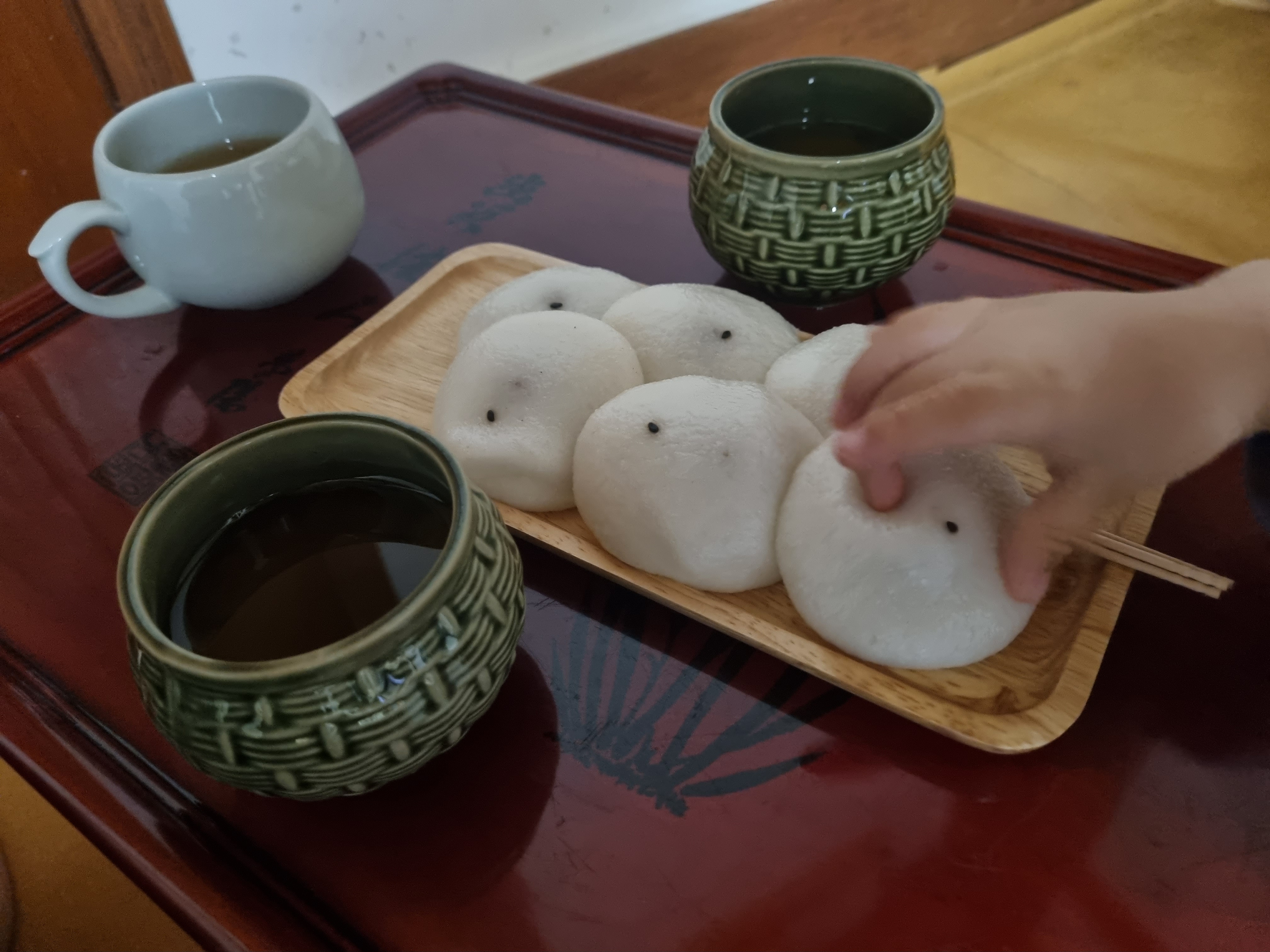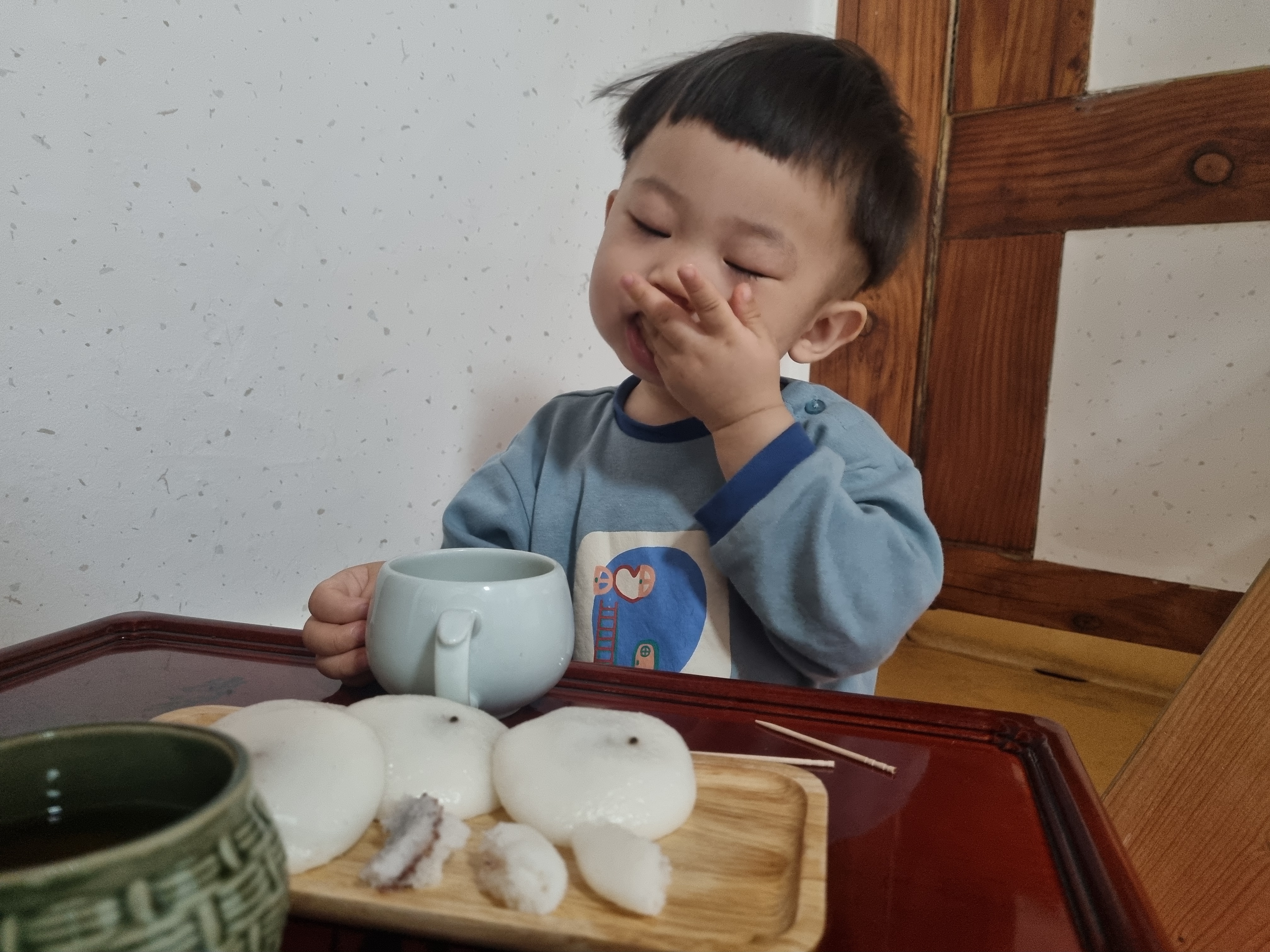 기억으로는 유로 한정식도 있었던 것 같은데 지금은 모르겠습니다, 저희는 아침을 안 먹는 타입이라 무료로 제공해주시는 차와 떡만 먹고 체크아웃을 했습니다. 증편과 매실차는 거의 고정으로 나오는 것 같고 종종 보리 과자와 약과도 주시는 것 같습니다. 무료 조식(간식)은 사장님 마음 같아요. 매실차는 소화에 좋은데 저녁에 온종일 먹었던 것들이 아침 매실차와 함께 진정이 되는 것 같았습니다. 아이도 부담 없이 먹을 수 있는 증편이라 너무 잘 먹었습니다. 솔직히 이 숙박 비용에 이런 서비스까지, 되려 죄송한 기분까지 들더라고요.