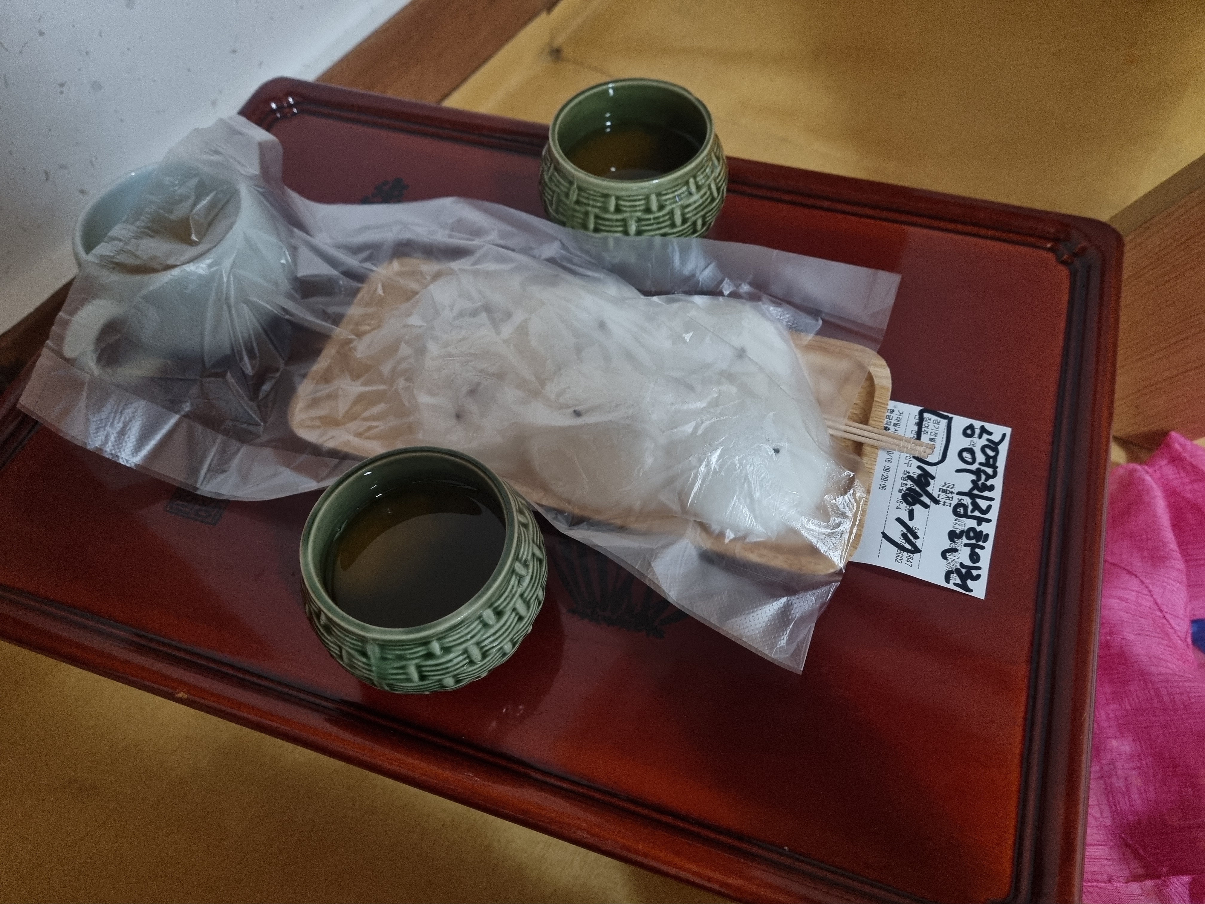 아침 10시가 되면 사장님께서 작은 선물을 방 문 앞에 두고 가십니다. 덮어놓은 천을 들추면 따뜻한 증편과 매실차가 준비되어있습니다. 아이와 함께하니 매실차 또한 3잔을 주셔서 감사히 먹었습니다. 이때 체크인 때 요청했던 주차 50% 할인 영수증을 함께 챙겨주십니다.