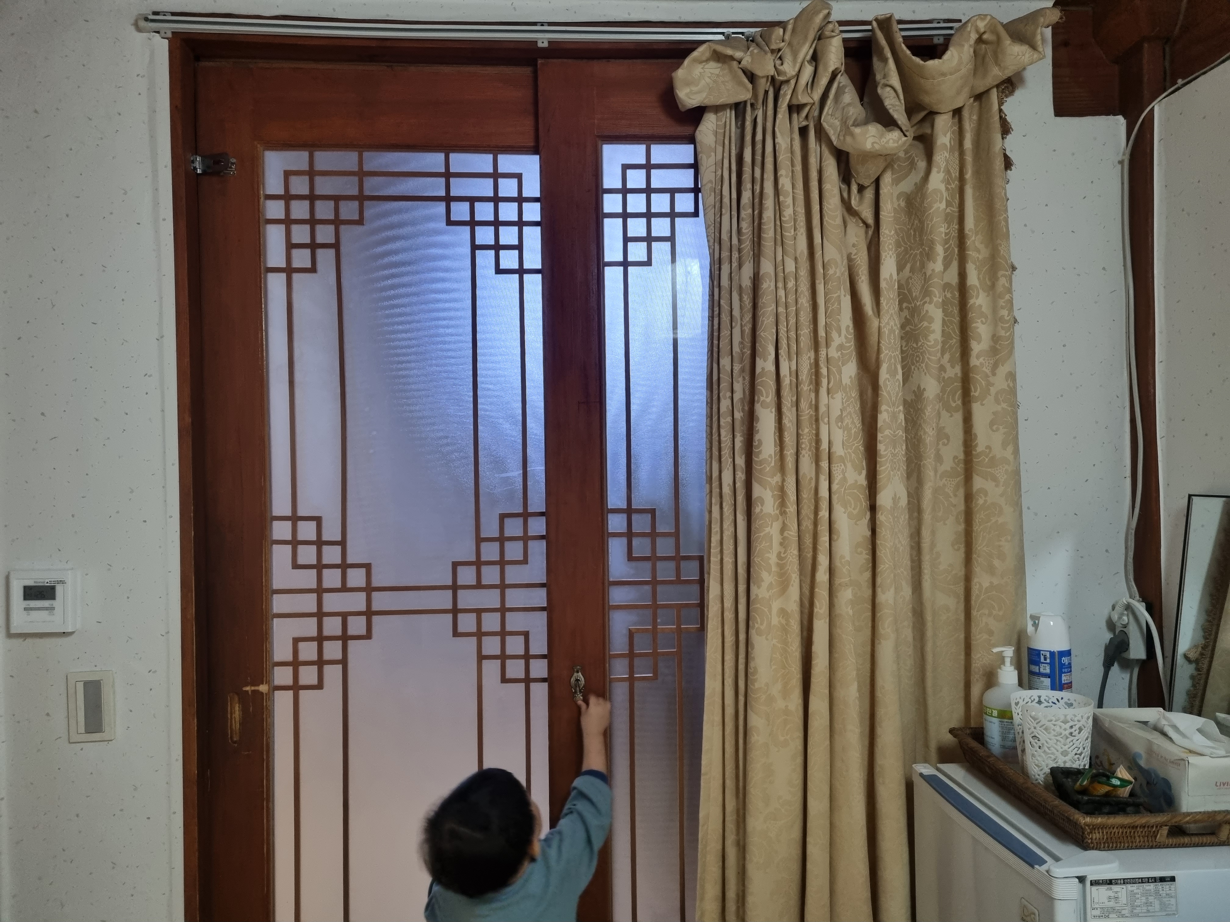 율곡 방은 현관에 들어가 거실 안쪽으로 가장 작은 방입니다. 문은 특이하게 미닫이 고리 잠금으로 되어있었어요. 다른 방들은 평범한 문이던데 율곡 방은 특이했어요. 아이가 만지기도 잘하고 누군가 쉽게 들어올 것 같아 불안한 마음은 아무래도 있었습니다.