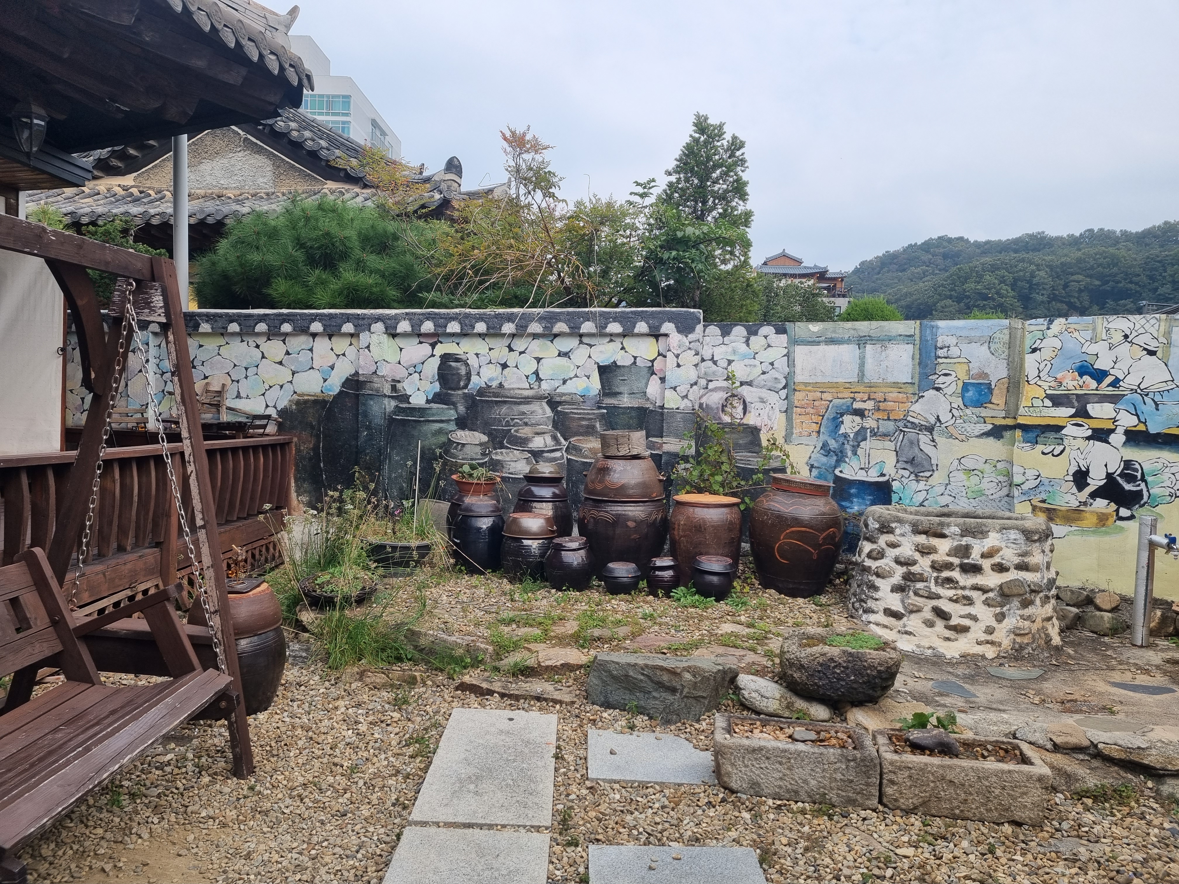 한옥집은 이렇게 집 마당 또한 넓어서 아이와 함께하기 정말 좋은 곳 같습니다. 부담 없이 뛰어다니고 이것저것 만지며 보고 느끼는 경험들이 보다 풍성해지는 것 같아요. 항아리와 우물, 피그닉 벤치와 평상, 흔들의자까지 앞마당에 모두 마련해주셨습니다. 이 공간은 투숙객이라면 모두 편하게 이용이 가능합니다. 사장님께 말씀드리면 돗자리도 꺼내 주신다고 해요.